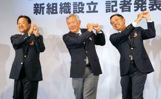 新会社設立の記者会見でポーズをとる(左から)JGTOの倉本昌弘副会長、諸星裕会長、NSSKの津坂純社長=26日、東京都千代田区