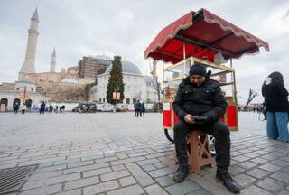 トルコ・イスタンブールで、世界遺産アヤソフィア前の閑散とした広場で、パンを売るムファレウム・イェシュタシュさん=16日(共同)