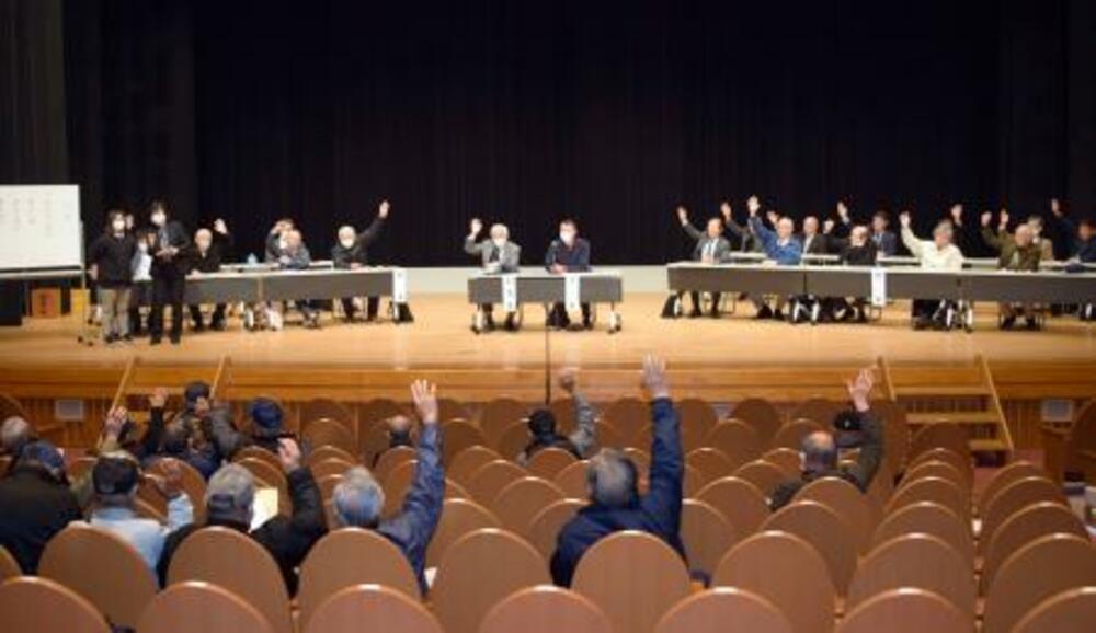 球磨川漁協の総会で行われた、漁業補償金の配分案の賛否を問う採決=26日午後、熊本県八代市