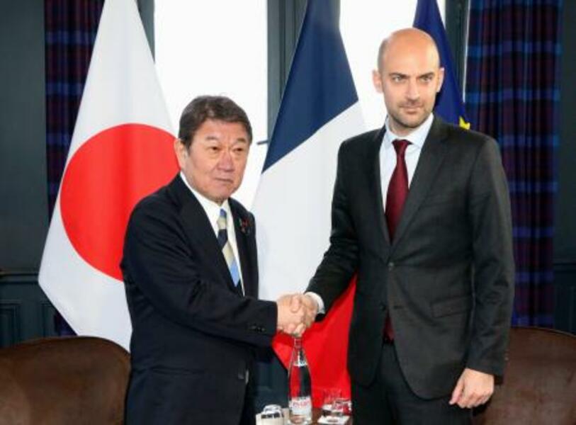 フランスのバロ外相(右)と握手する茂木外相=26日、パリ近郊セルネラビル(共同)