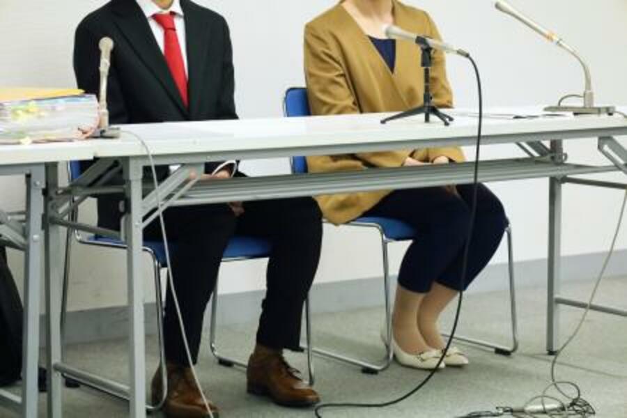 判決後、記者会見する原告の男性(左)と母親=27日午後、横浜市中区