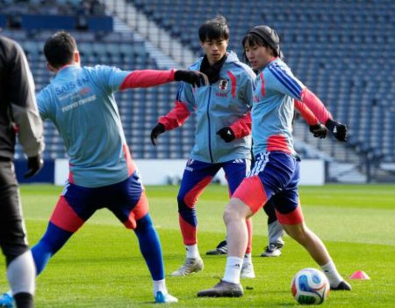 スコットランド戦に向け最終調整する三笘(中央)ら=グラスゴー(共同)