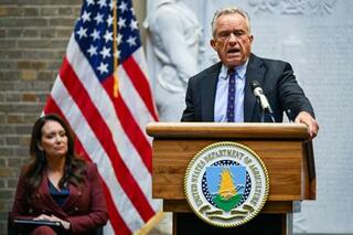 24日、ワシントンの米農務省で開かれたイベントで話すケネディ厚生長官(右)(ロイター=共同)