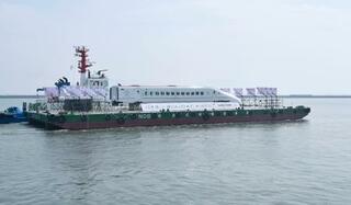 熊本港を船で出発する九州新幹線つばめの車両=29日午後、熊本市