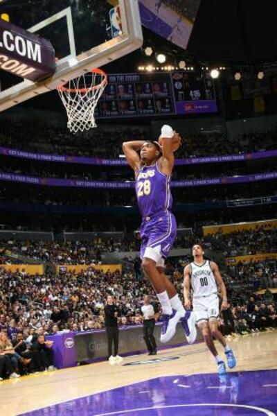 ネッツ戦でダンクシュートを狙うレーカーズの八村=ロサンゼルス(NBAE・ゲッティ=共同)
