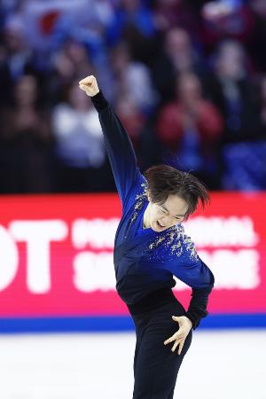 男子フリーの演技を終え、ガッツポーズする鍵山優真=28日、プラハ