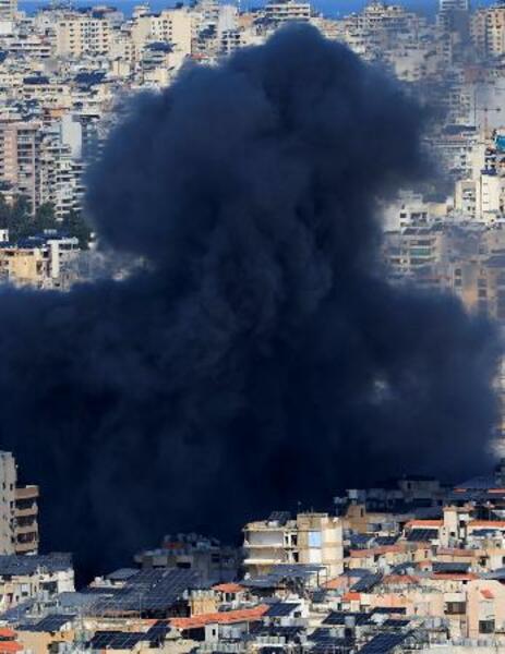 9日、レバノン・ベイルート郊外で、イスラエル軍の攻撃後に立ち上った煙(ロイター=共同)