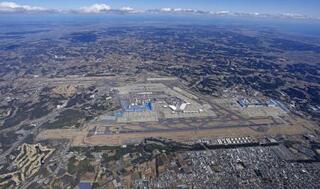 C滑走路新設とB滑走路(左上)の延伸を計画する成田空港=2024年3月