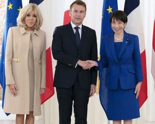 フランスのマクロン大統領(中央)を出迎え、握手する高市首相。左はブリジット夫人=1日午後、東京・元赤坂の迎賓館