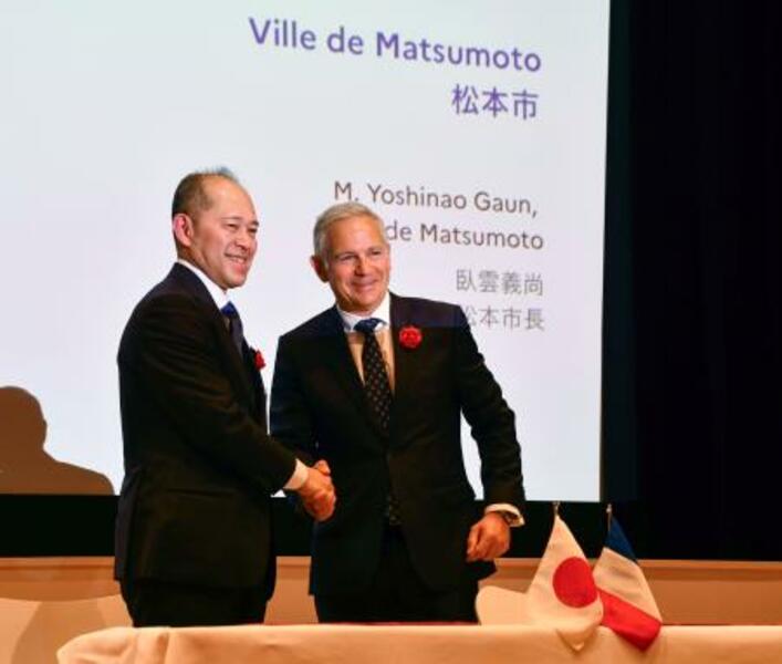 握手する長野県松本市の臥雲義尚市長(左)とシャンボール国立公園トップのピエール・デュブルイユ氏=1日午後、東京都港区