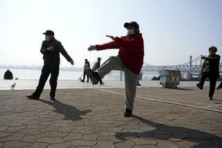 体を動かすお年寄り=3月、中国遼寧省丹東市(共同)