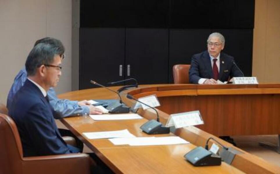 米軍嘉手納基地でのパラシュート降下訓練実施について、防衛省沖縄防衛局の村井勝局長(左手前)らに抗議する沖縄県の宮城嗣吉副知事=2日午後、沖縄県庁