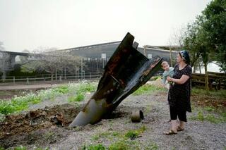 ヨルダン川西岸のユダヤ人入植地で、イランから発射され着弾した弾道ミサイルを見るイスラエル人女性=3日(ゲッティ=共同)