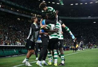 ポルトガル1部リーグのサンタクララ戦でゴールを喜ぶスポルティングの選手たち=3日、リスボン(ロイター=共同)