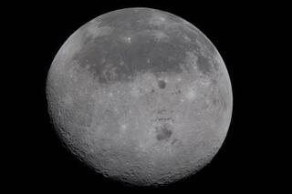NASAが6日に提供した月の写真。上側が表側、中央下側にある巨大クレーター「東の海」より下は裏側(AP=共同)