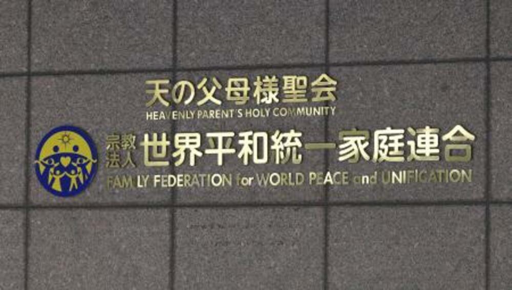 世界平和統一家庭連合(旧統一教会)の本部が入るビルに掲げられた教団の名称=2025年12月、東京都渋谷区