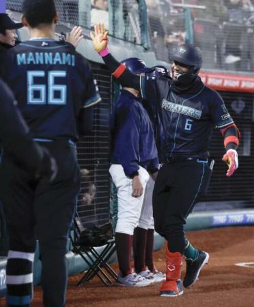 4回、先制本塁打を放ち、ナインに迎えられる日本ハムのカストロ=楽天モバイルパーク
