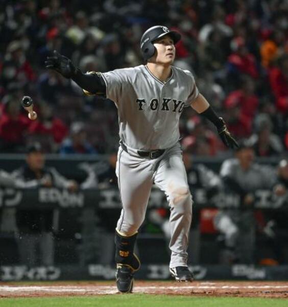 9回巨人無死二塁、泉口が右越えに逆転2ランを放つ=マツダ