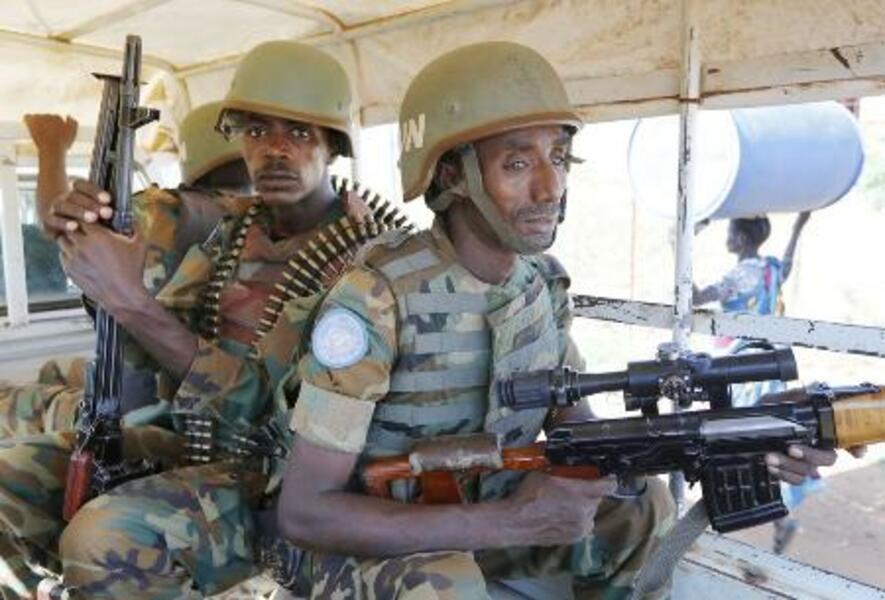 2016年11月、避難民キャンプの周囲を警戒するUNMISS部隊=南スーダン・ジュバ(共同)