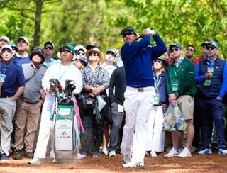 第1ラウンド、2番で第2打を放つ松山英樹=オーガスタ・ナショナルGC(共同)