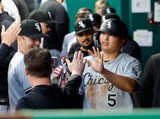 ロイヤルズ戦の4回、後続の適時打で先制の生還を果たし、迎えられるホワイトソックス・村上=カンザスシティー(共同)