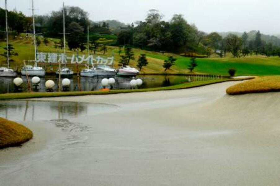 水たまりができたバンカー(手前)。悪天候で第2ラウンドが中止となった=東建多度CC名古屋