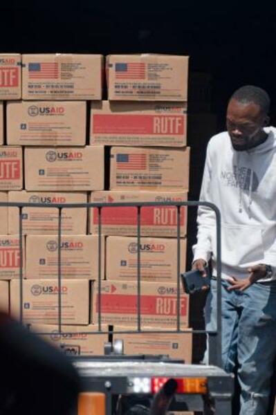 コンゴの首都キンシャサ郊外の倉庫から運び出されるUSAIDの支援物資=2025年4月(共同)