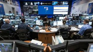 パラシュートを開いた宇宙船オリオンの着水を見守る管制担当者ら=10日、米テキサス州ヒューストンのジョンソン宇宙センター(NASA提供)