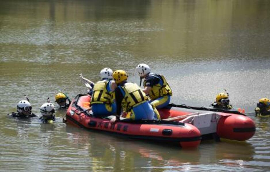母親と娘が殺害された事件で、現場近くの池を調べるダイバーら=11日午前11時44分、大阪府和泉市