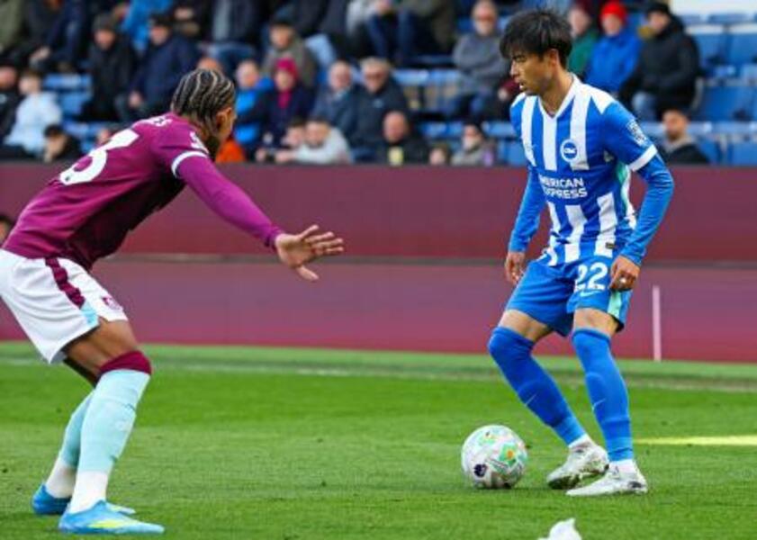 バーンリー戦の後半、プレーするブライトンの三笘(右)=バーンリー(共同)