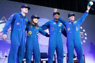 帰還を歓迎するイベントに登壇した船長のワイズマン飛行士(右端)ら4人=11日、米南部テキサス州ヒューストン(AP=共同)