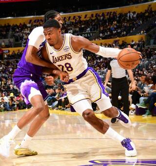ジャズ戦で攻め込むレーカーズの八村(右)=ロサンゼルス(NBAE・ゲッティ=共同)