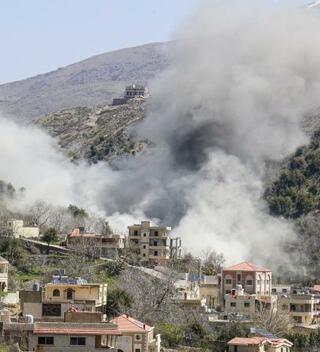 14日、レバノン南部ナバティエ県で空爆後に立ち上る煙(ゲッティ=共同)