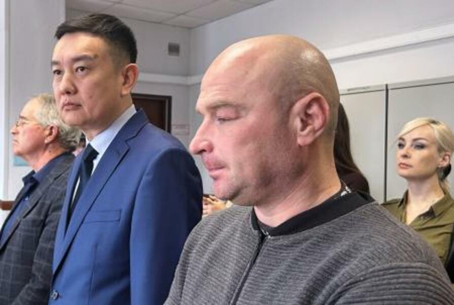 ロシア極東ウランウデの裁判所で強制労働3年の判決を受けた男性(手前)=14日(タス=共同)