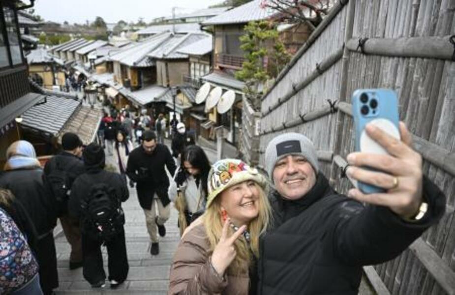 京都・清水寺近くの二年坂で記念撮影する訪日客=1月