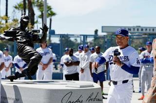 「ジャッキー・ロビンソン・デー」の式典で話すドジャースのロバーツ監督(手前)=ロサンゼルス(共同)