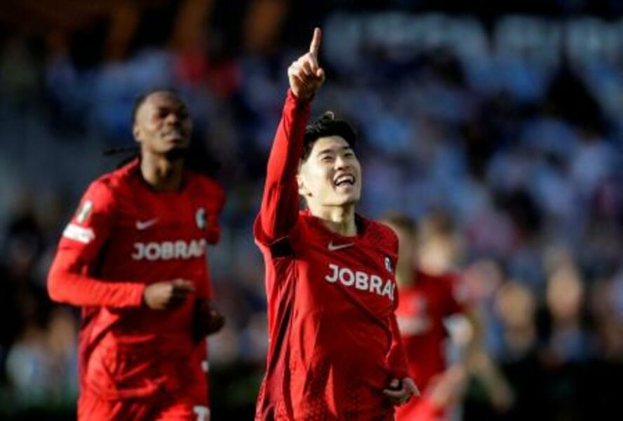 ゴールを決めたフライブルクの鈴木唯人=16日、スペイン・ビゴ(ロイター=共同)