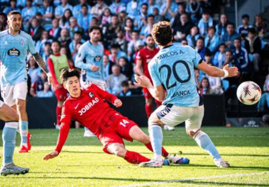 セルタ戦の前半、ゴールを決めるフライブルクの鈴木唯人=ビゴ(共同)