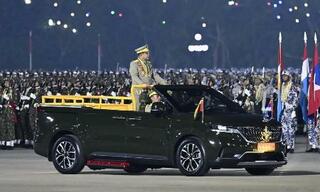 3月、ミャンマーの首都ネピドーで開かれた国軍記念日の式典に出席した軍事政権トップのミンアウンフライン国軍総司令官(当時)