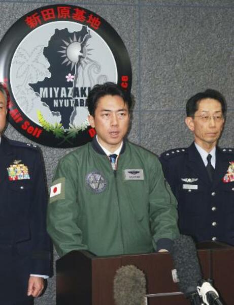 宮崎県の航空自衛隊新田原基地で取材に応じる小泉防衛相=1月