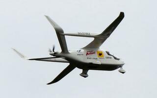 北九州空港を離陸した電動航空機=17日午後(北九州市提供)