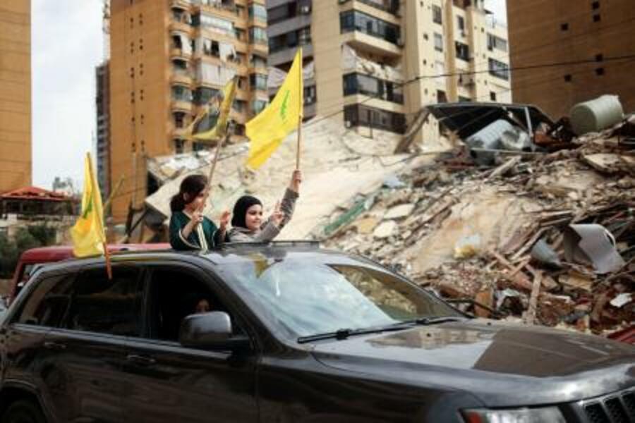 レバノン・ベイルート南部で、イスラエルとの停戦発効を受けて家に向かう少女たち=17日(ロイター=共同)