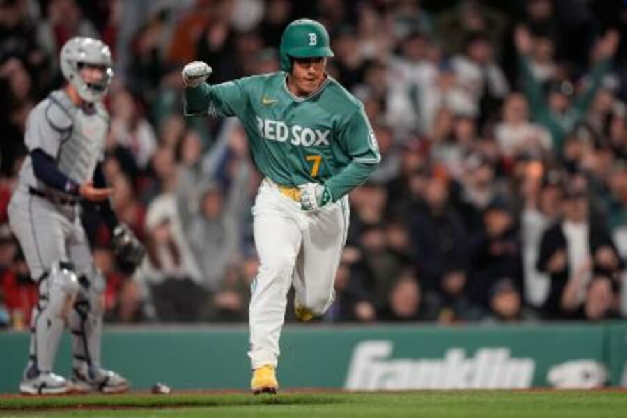タイガース戦の延長十回、サヨナラ打を放ちガッツポーズするレッドソックスの吉田正尚=17日、ボストン(AP=共同)