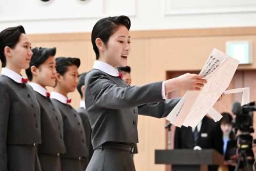 宝塚音楽学校の入学式で答辞を述べる、新入生総代の西前比草さん=18日午前、兵庫県宝塚市