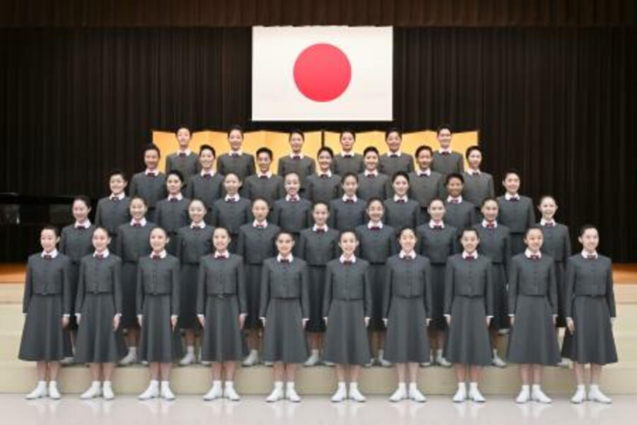 記念写真に納まる宝塚音楽学校の新入生=18日午前、兵庫県宝塚市