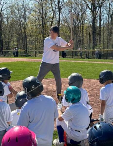 野球教室で子どもたちに指導をする松井秀喜さん=18日、ニューヨーク市近郊(共同)