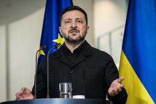 記者会見するウクライナのゼレンスキー大統領=14日、ドイツ・ベルリン(ゲッティ=共同)