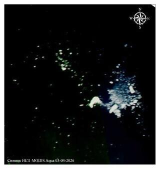砕けて分離する氷山「A23a」の衛星写真=3日(ロシアの北極・南極学術調査研究所提供、共同)