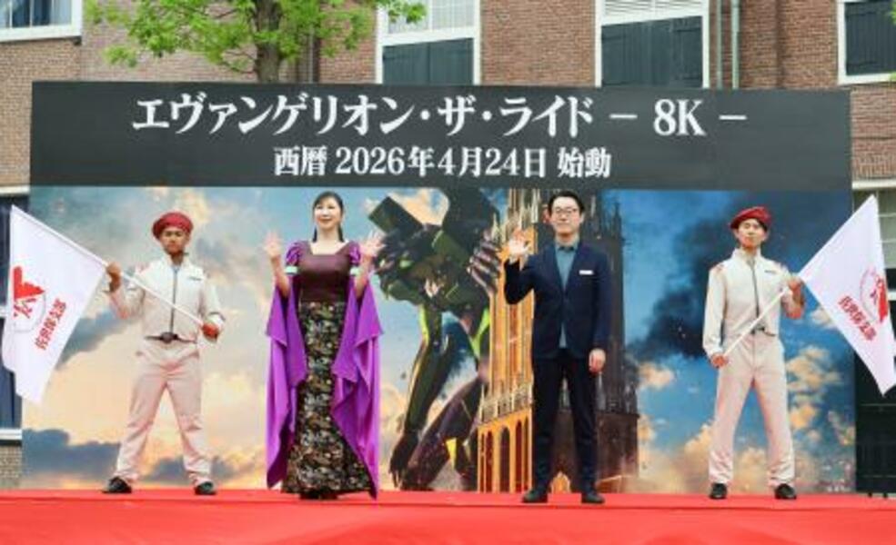 エヴァンゲリオンの新アトラクションの記念式典に登壇したハウステンボスの高村耕太郎社長(中央右)と高橋洋子さん(同左)=22日午後、長崎県佐世保市