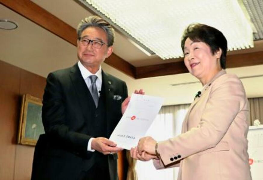 山形県の吉村美栄子知事(右)から「福」知事の辞令を交付された船越英一郎さん=23日午後、山形県庁